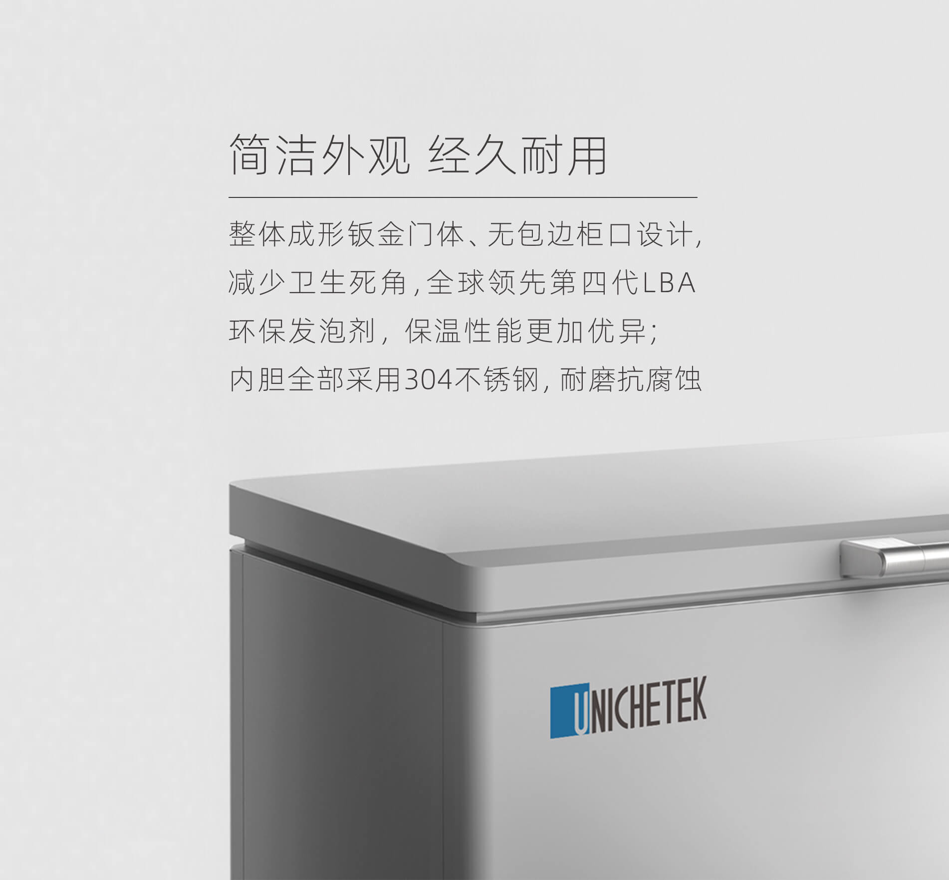 整体成形钣金门体、无包边柜口设计,  减少卫生死角,全球领先第四代LBA 环保发泡剂,保温性能更加优异; 内胆全部采用304