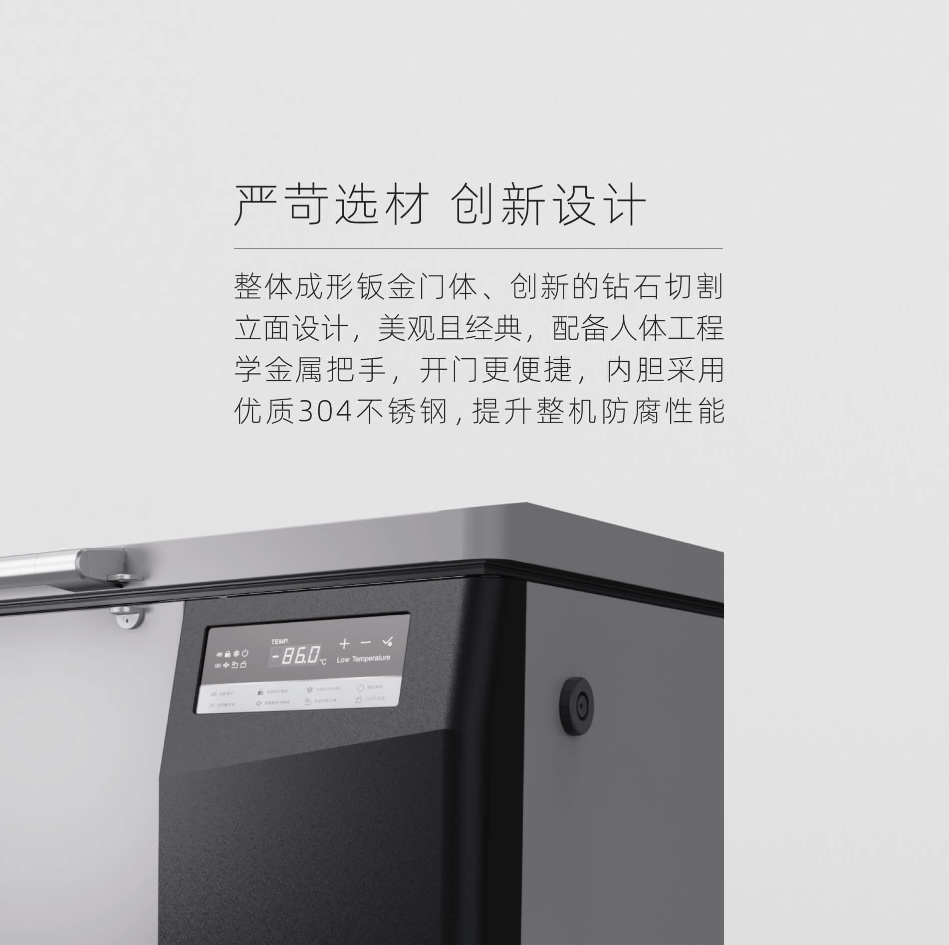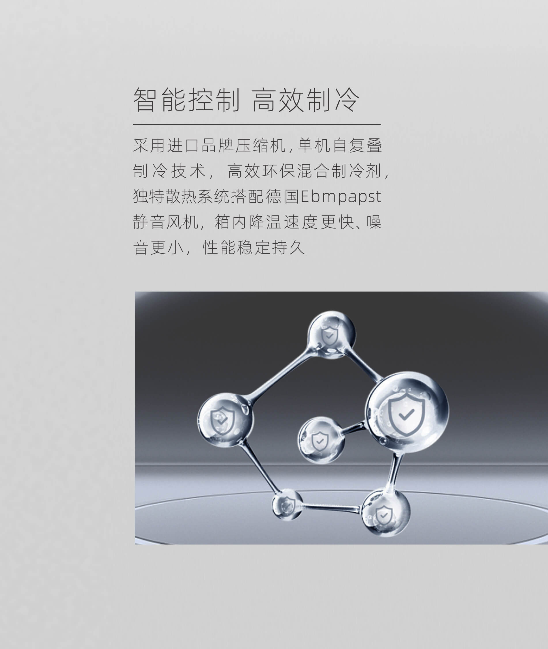 采用进口品牌压缩机,单机自复叠 制冷技术,高效环保混合制冷剂, 独特散热系统搭配德国Ebmpapst 静音风机,箱内降温速度更