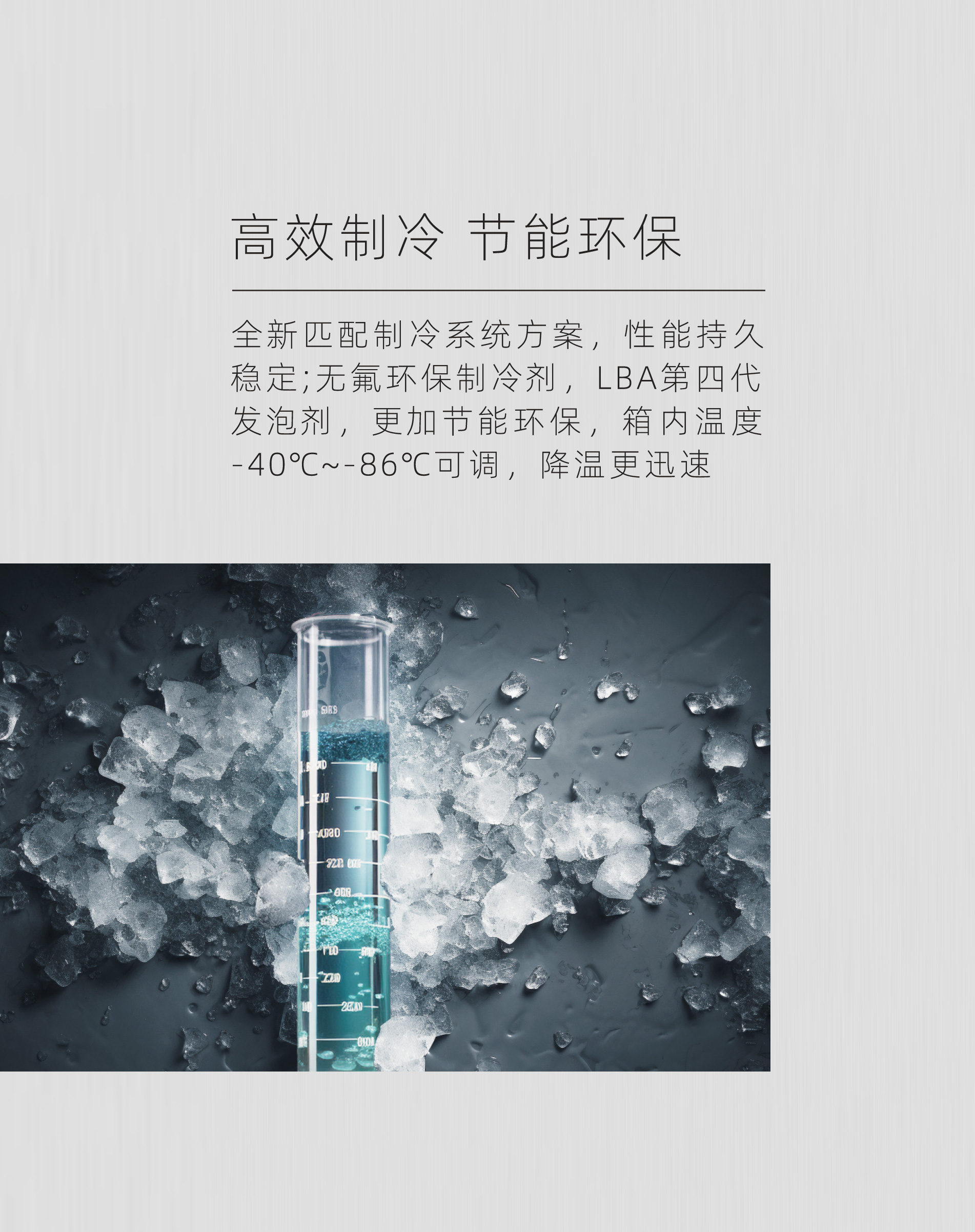 全新匹配制冷系统方案,性能持久 稳定;无氟环保制冷剂,LBA第四代 发泡剂,更加节能环保,箱内温度 -40℃~-86℃可调,